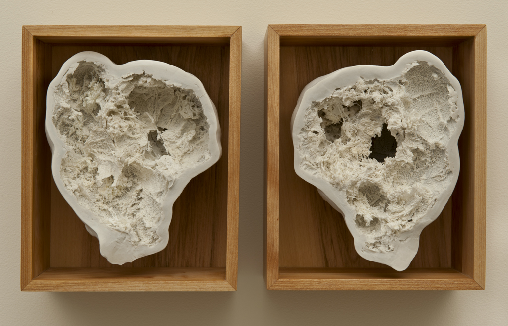 ![Amélie Proulx, Coquilles de nœuds, 2011, porcelaine, bois, 22 x 41 x 10 cm (chaque diptyque). Photo : Steve Farmer]()